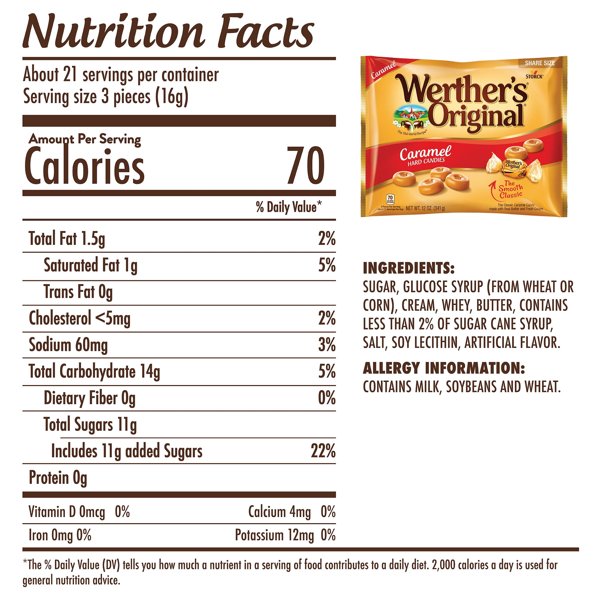 Enjoy a sweet treat with Werther’s Original Caramel Hard Candies. They melt smoothly in your mouth, leaving a buttery sweet taste that lingers. Werther’s Original is made with only the finest ingredients blended together with the same passion and care our first candy maker, Gustav Nebel, brought to every candy he crafted. Made with real butter and fresh cream, for a one-of-a-kind taste. Allergen Statement Milk Allergen-Free Statements Shellfish-Free.