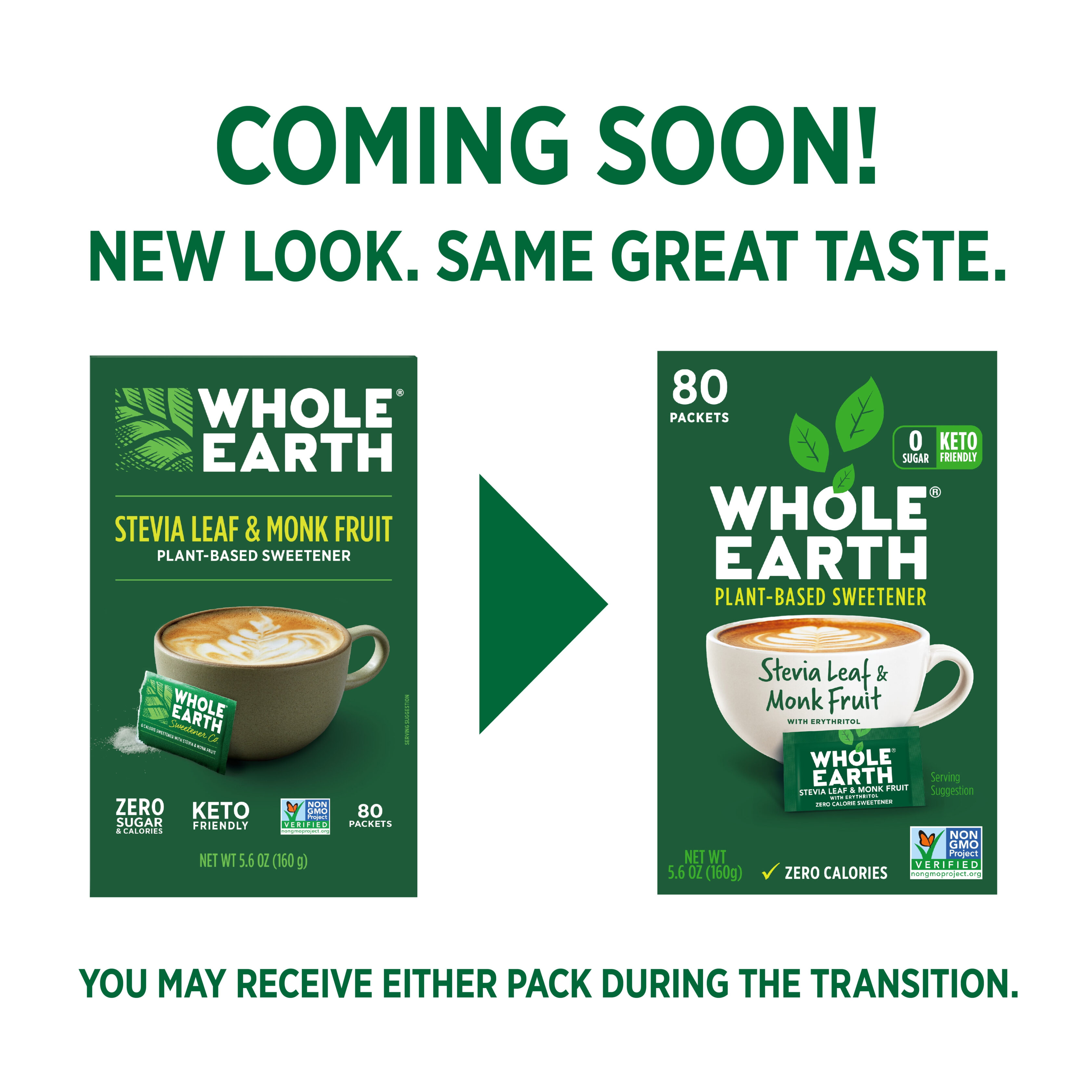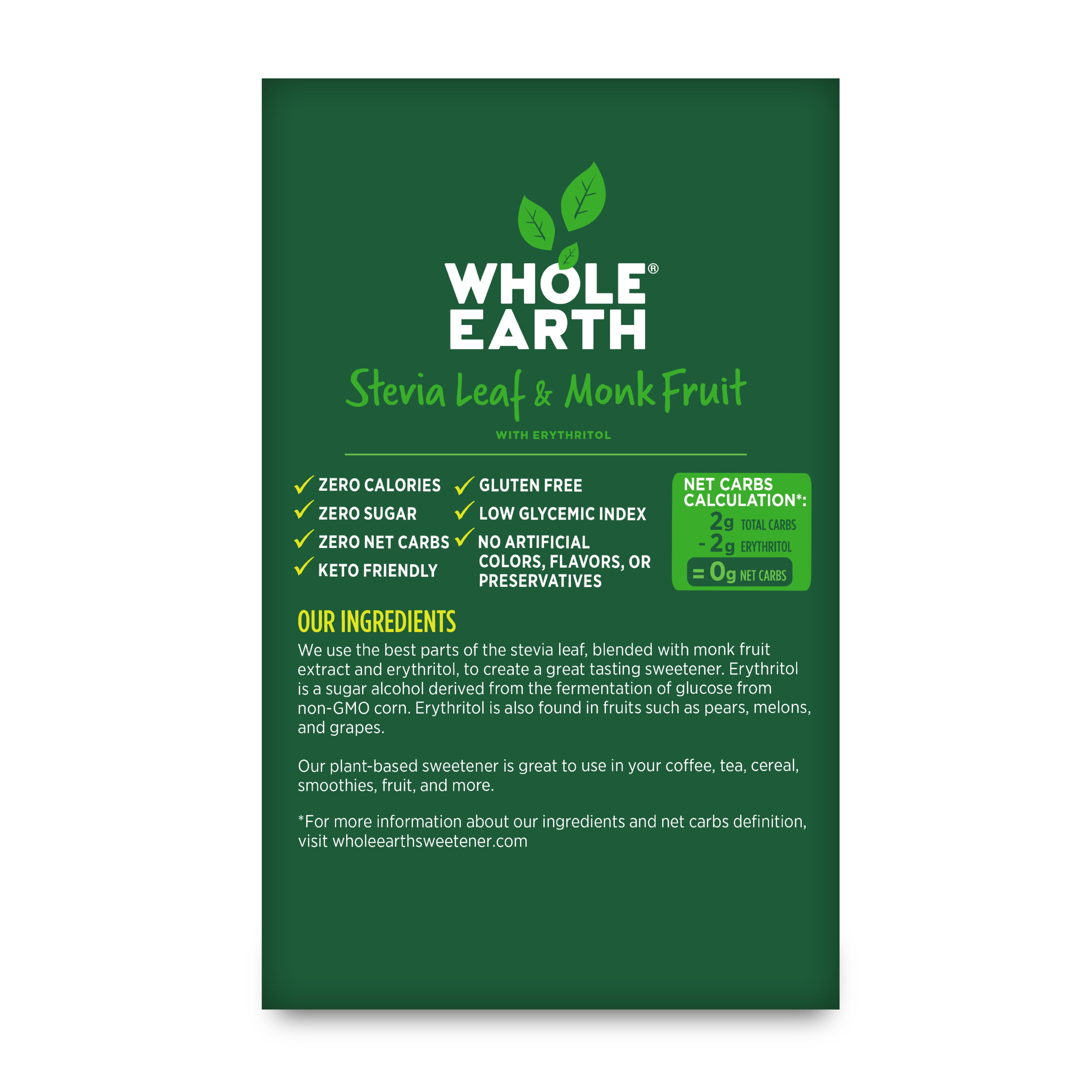 - ERYTHRITOL SWEETENER: Each carton contains 80 packets of delicious WHOLE EARTH SWEETENER Stevia and Monk Fruit Natural* Sweetener