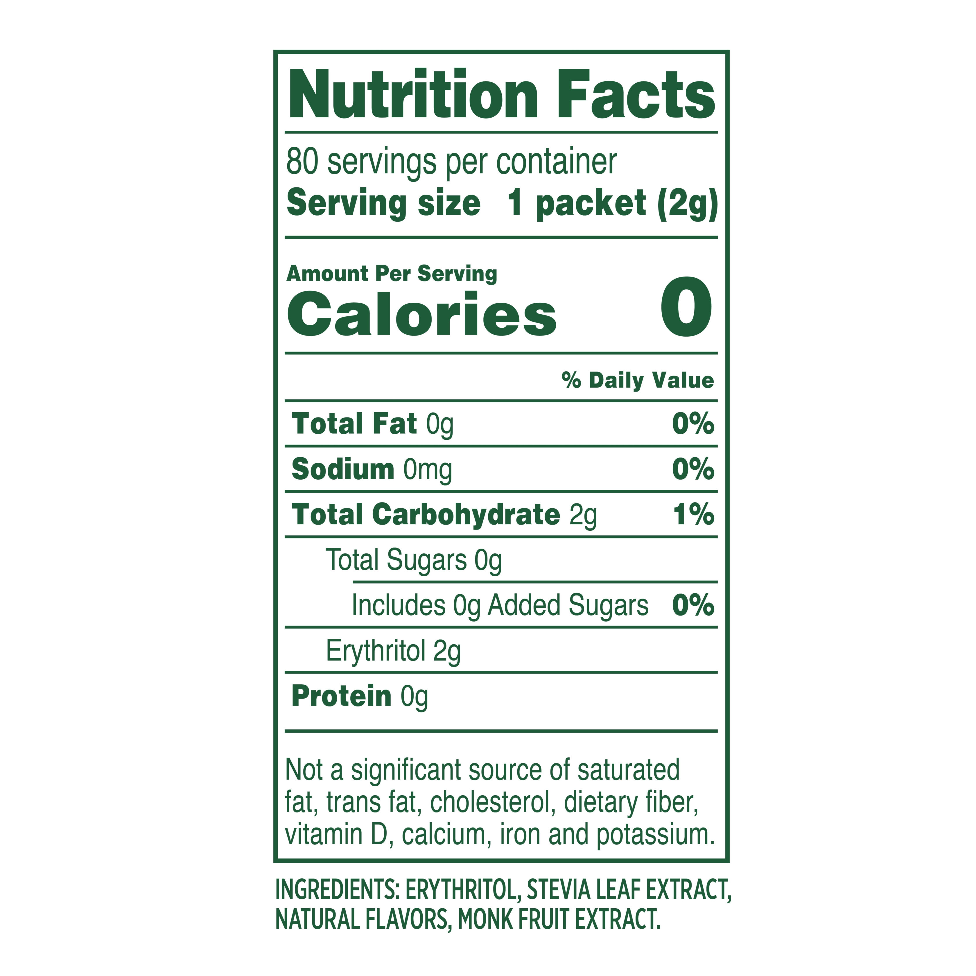 - ZERO CALORIE SWEETENER: Contains no calories, no preservatives, no artificial flavors and no artificial colors; It is gluten free, Non-GMO Project Verified