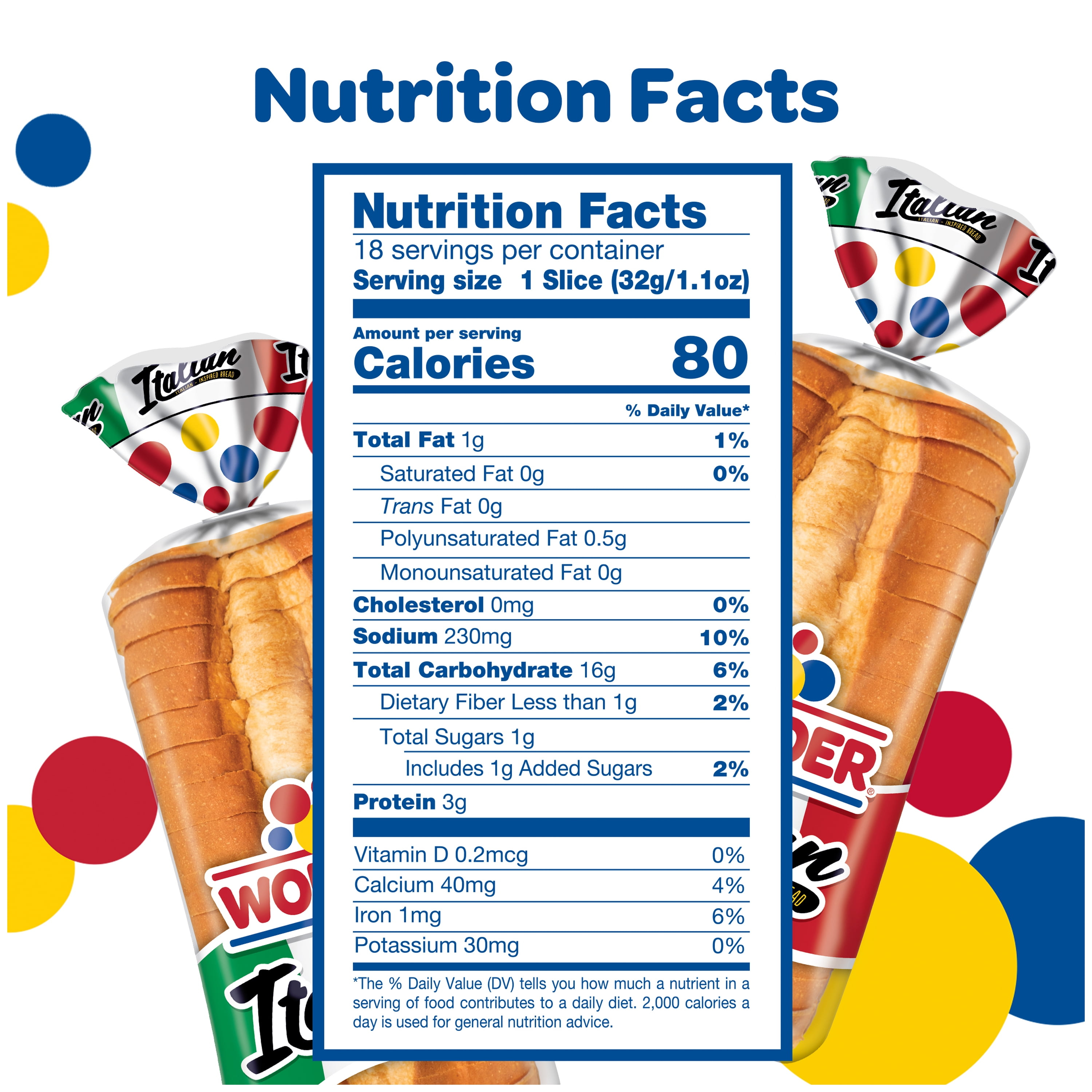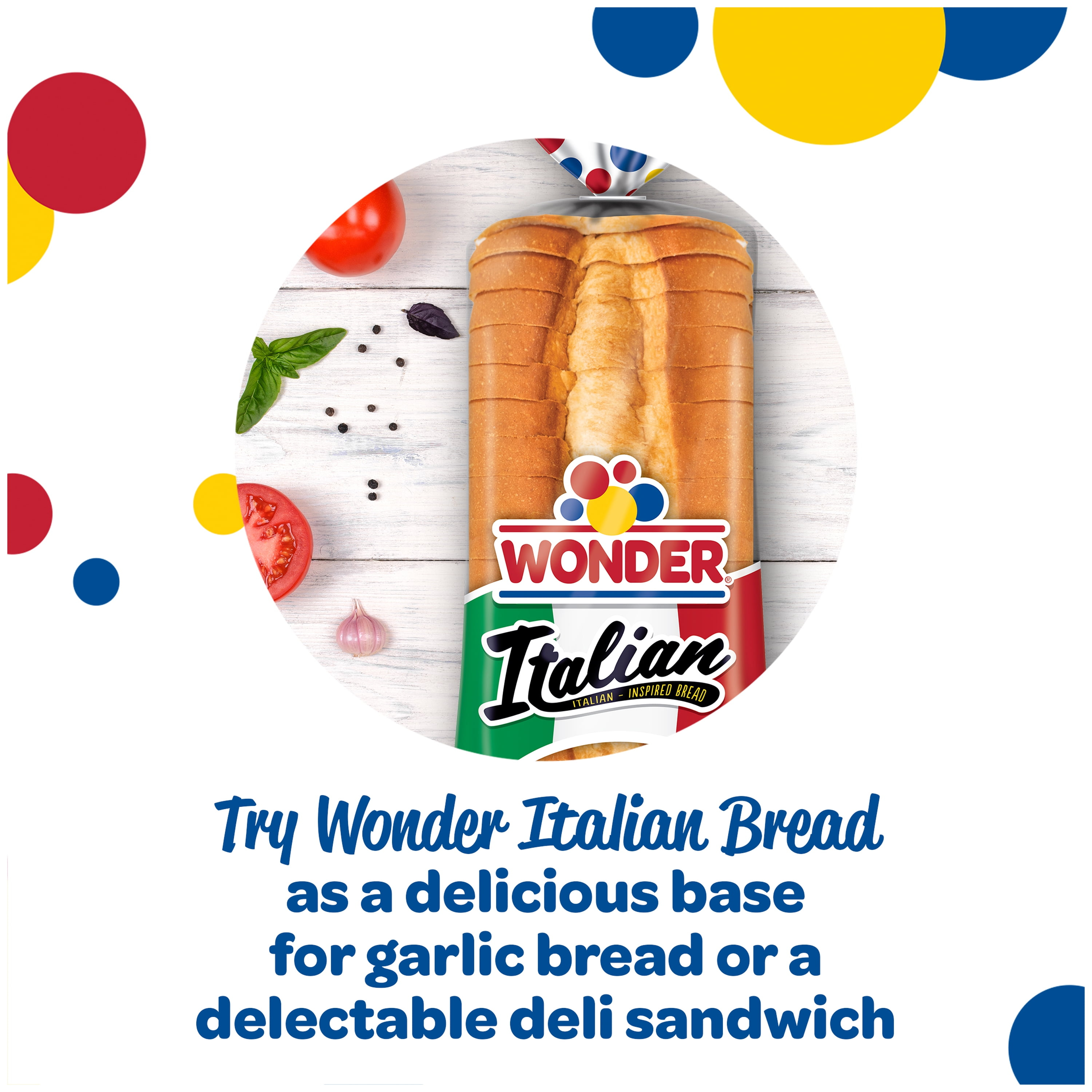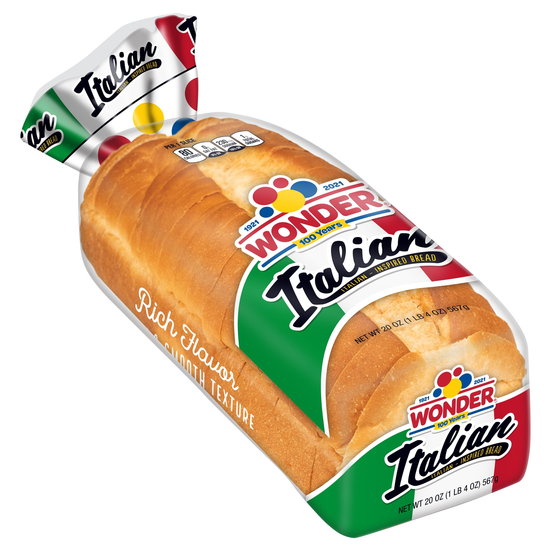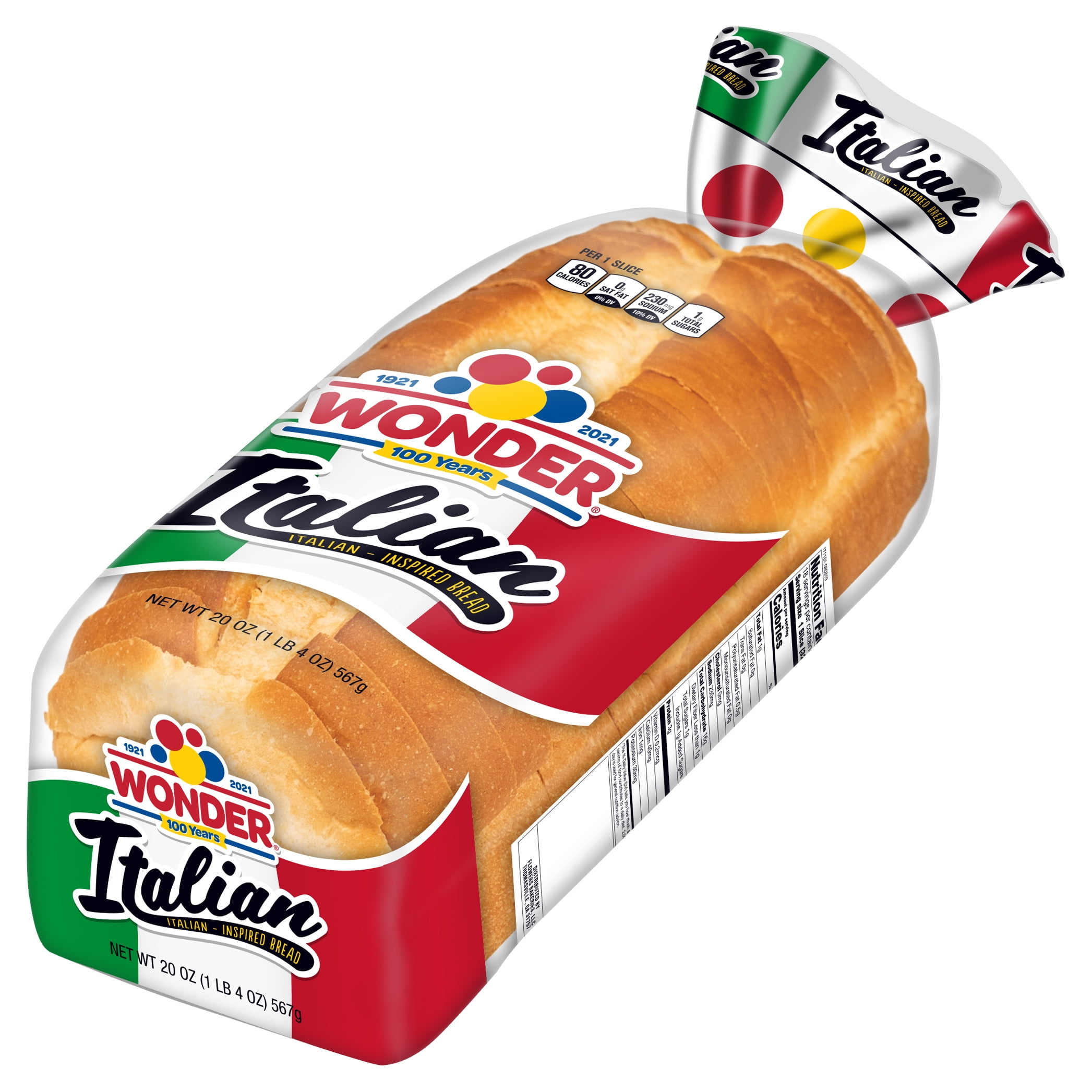 Wonder® Italian Bread is Italian-inspired bread featuring wide slices and a soft, smooth texture to bring the taste of Italy to your dinner table. This pre-sliced, 20 oz baked shelf-stable white bread makes an ideal base for garlic bread or an extra wide deli sandwich. The rich flavor in Wonder’s Italian-inspired bread is the perfect way to add a distinctive touch to everyday meals or to make your own celebrations with family and friends something special. Wonder Italian Bread has 0g of saturated fat per serving and each slice is 80 calories. Feed your joy with Wonder! Since 1921, Wonder has been bringing delicious tasting, soft textured bread to the table and pleasing generations of families in the process! Today, Wonder is still enjoyed by millions of Americans across the nation, where it’s packed in lunchboxes, served in restaurants and craved by those young and old.