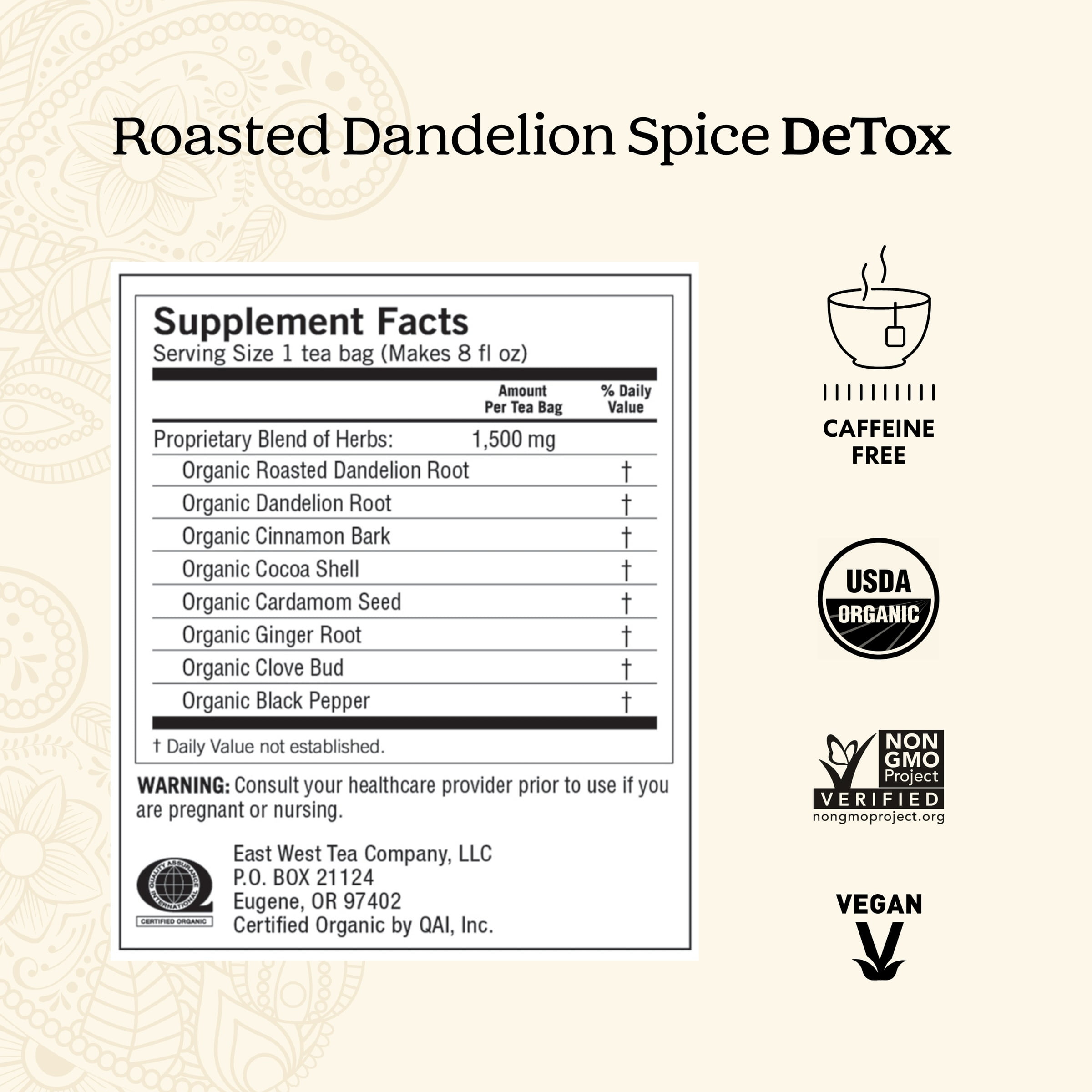 Yogi Tea Roasted Dandelion Spice DeTox Organic Herbal Tea Bags — Combines Roasted Dandelion and Dandelion Root, which are herbs traditionally used by herbalists to support the body’s natural cleansing processes. Cocoa Shell and Yogi’s traditional warming spice blend add rich, complex flavor to this intriguing herbal tea blend. Enjoy a deliciously purposeful cup of Yogi Tea Roasted Dandelion Spice DeTox to help you feel refreshed and in balance!* At Yogi we believe in using the highest quality spices and botanicals from around the world, we’re committed to sustainable practices by doing our part to protect and give back to the planet that gives us so much. Our tea bags are purposely blended with you in mind and care for the planet. Discover well-being that works for you. Find your flavor of well-being with Yogi tea.